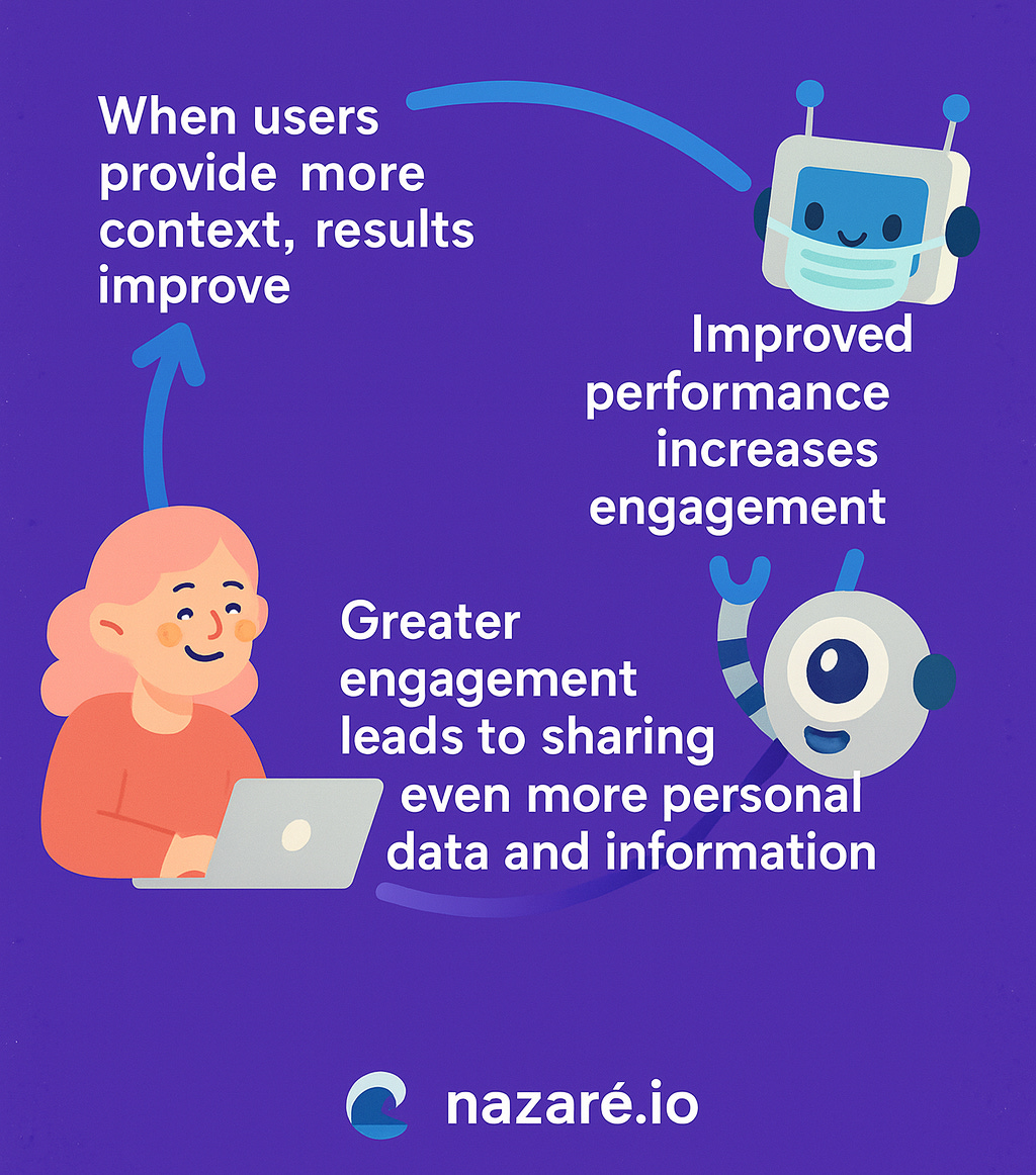 When users provide more context, results improve → Improved performance increases engagement → Greater engagement leads to sharing even more personal data and information.