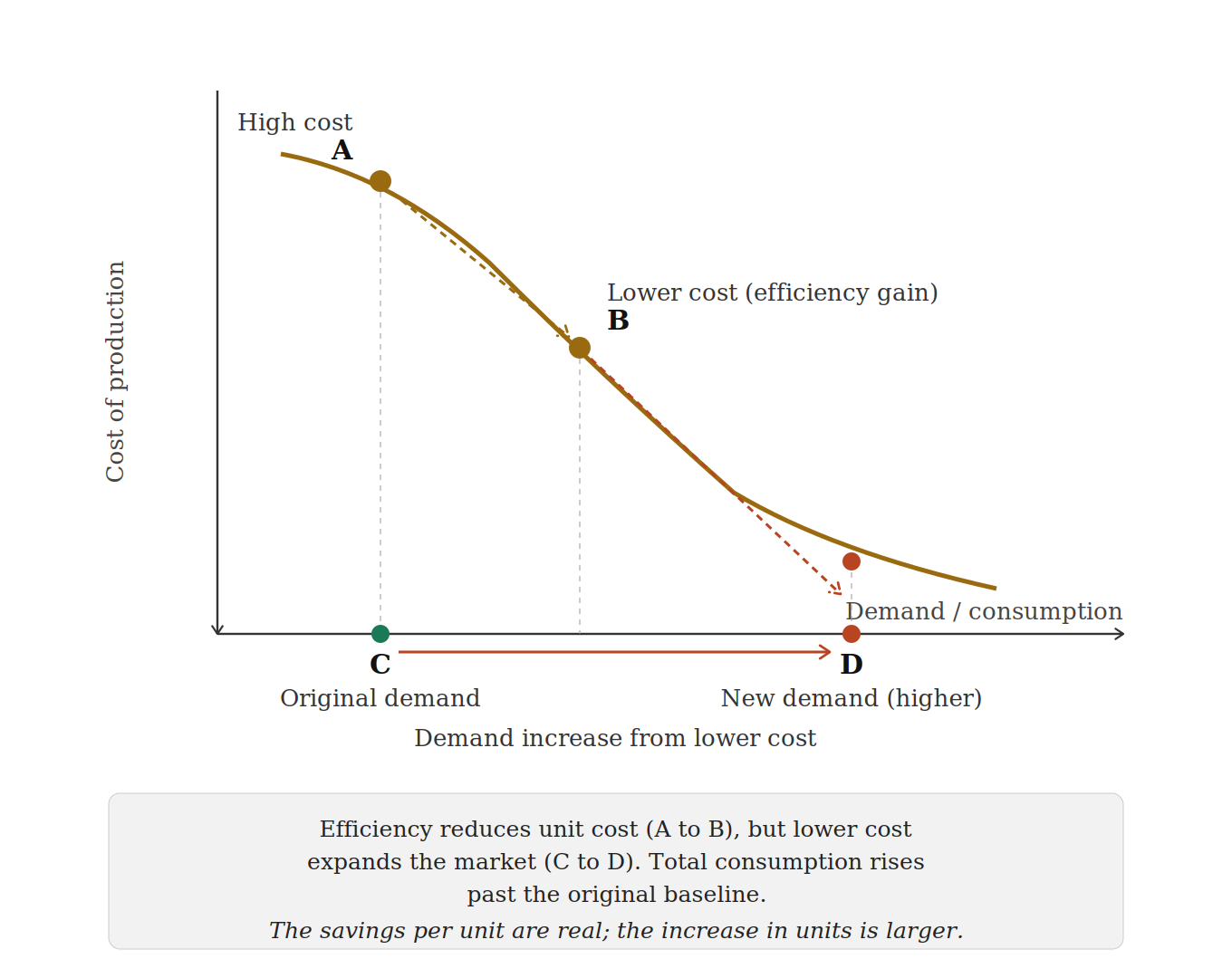 Lower cost per unit expands the addressable market. The expanded market drives total consumption past the original baseline.