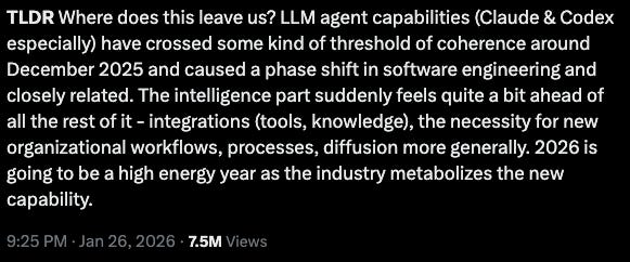 As Karpathy wrote, agents actually crossed the chasm in ~November/December of 2025.