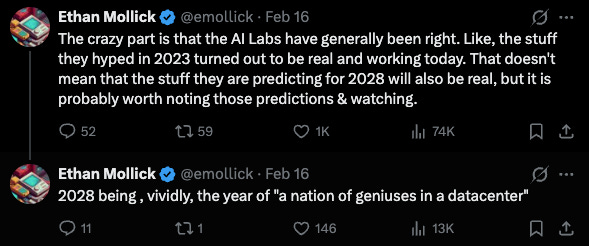 What’s more? As Ethan Mollick notes, the AI labs have generally been right. It is extremely tempting to judge the labs and their predictions almost instantly (see Dario’s prediction that AI will render knowledge work obsolete in the near future…). It doesn’t help that enormous amounts of money depend on these judgments and their accuracy, either… but maybe we should *try* thinking a bit longer-term.